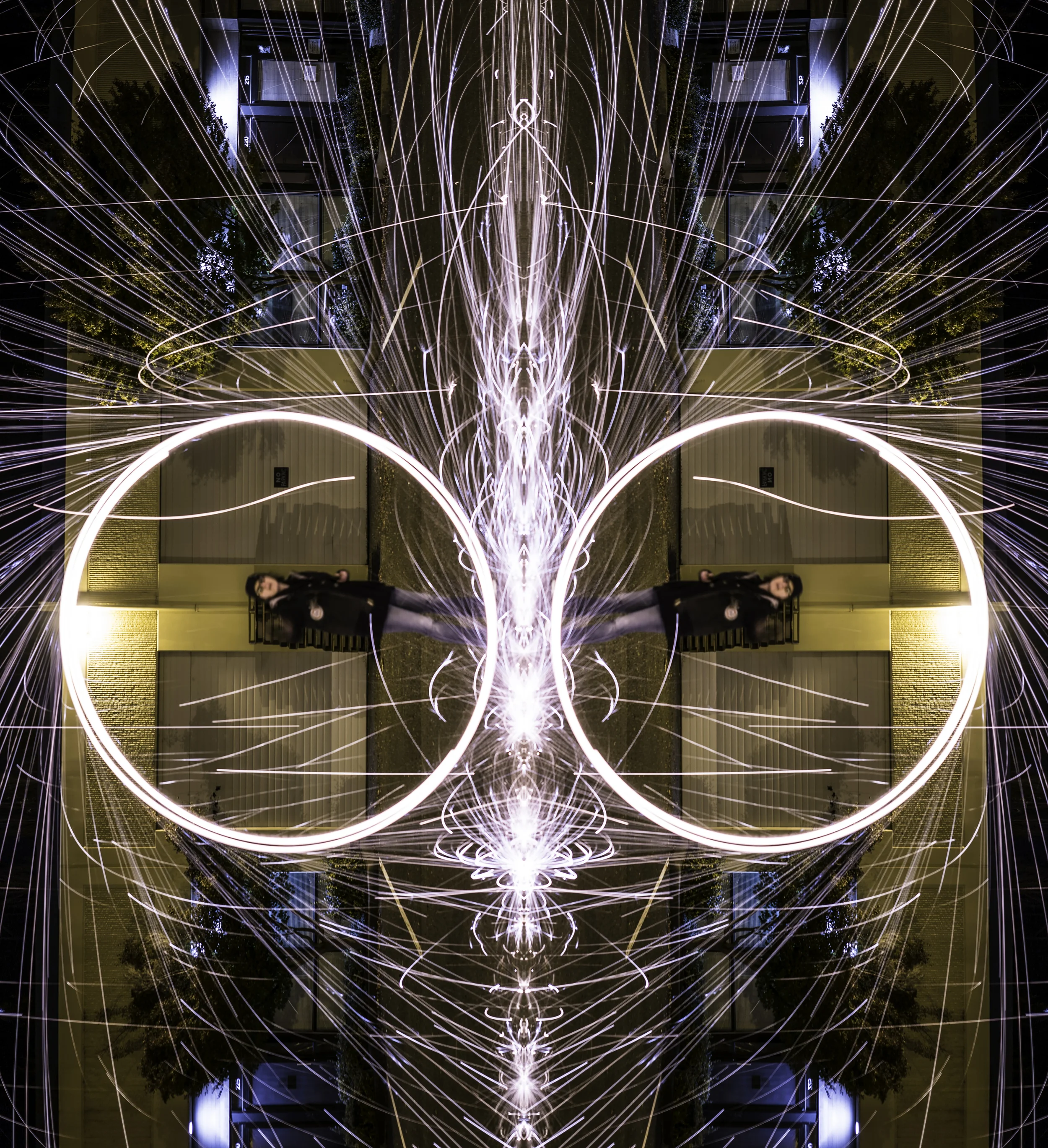 The Symmetric City project was an effort to capture the beauty of geometry and symmetry of cities and urban spaces. A camera with mirrors and final digital manipulation was used to end up with the final result. Some of the beauty was created by the camera overloading and producing corrupt images.